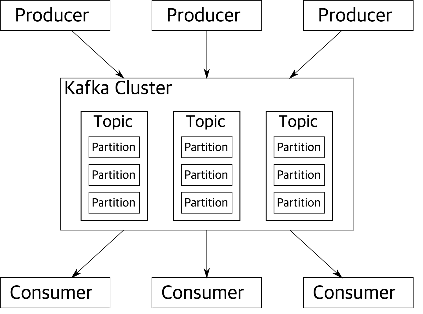 - Topic: 메시지를 구분하기 위한 카테고리화된 주제. Producer가 메시지를 발행하는 곳이며, Consumer는 특정 토픽에서 메시지를 소비한다. Topic은 1개 이상의 Partition으로 분할된다.