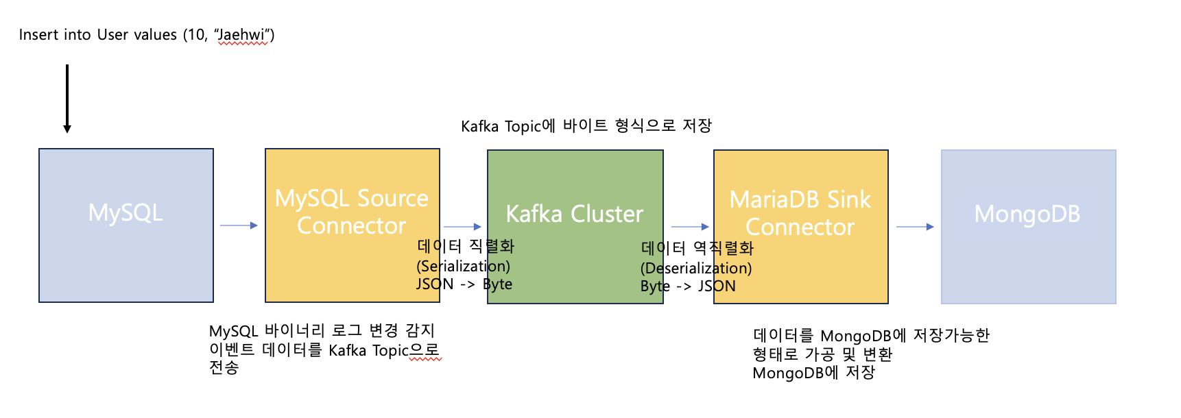 1. Source System(MySQL)에서 변경된 데이터를 Source Connector가 읽어오고, 이때 Source Connector에서 데이터를 적절한 형식으로 변환한다.