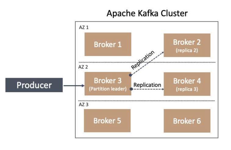 각각의 브로커들은 Topic의 Partition들을 분할하여 나누어 가져 담당하게 된다. 이 때 Fault Tolerance를 위하여 파티션들을 복제하며, 브로커들은 리더 파티션과 팔로워 파티션을 나누어 가지게 된다.