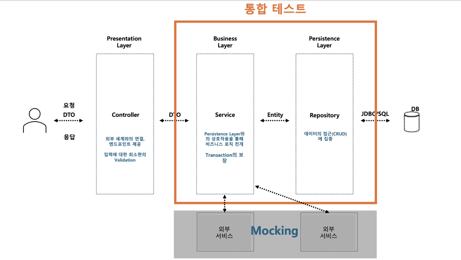따라서 의존성을 가지는 Repository, Service를 비롯한 다른 모듈들과와 함께 통합 테스트를 한다.