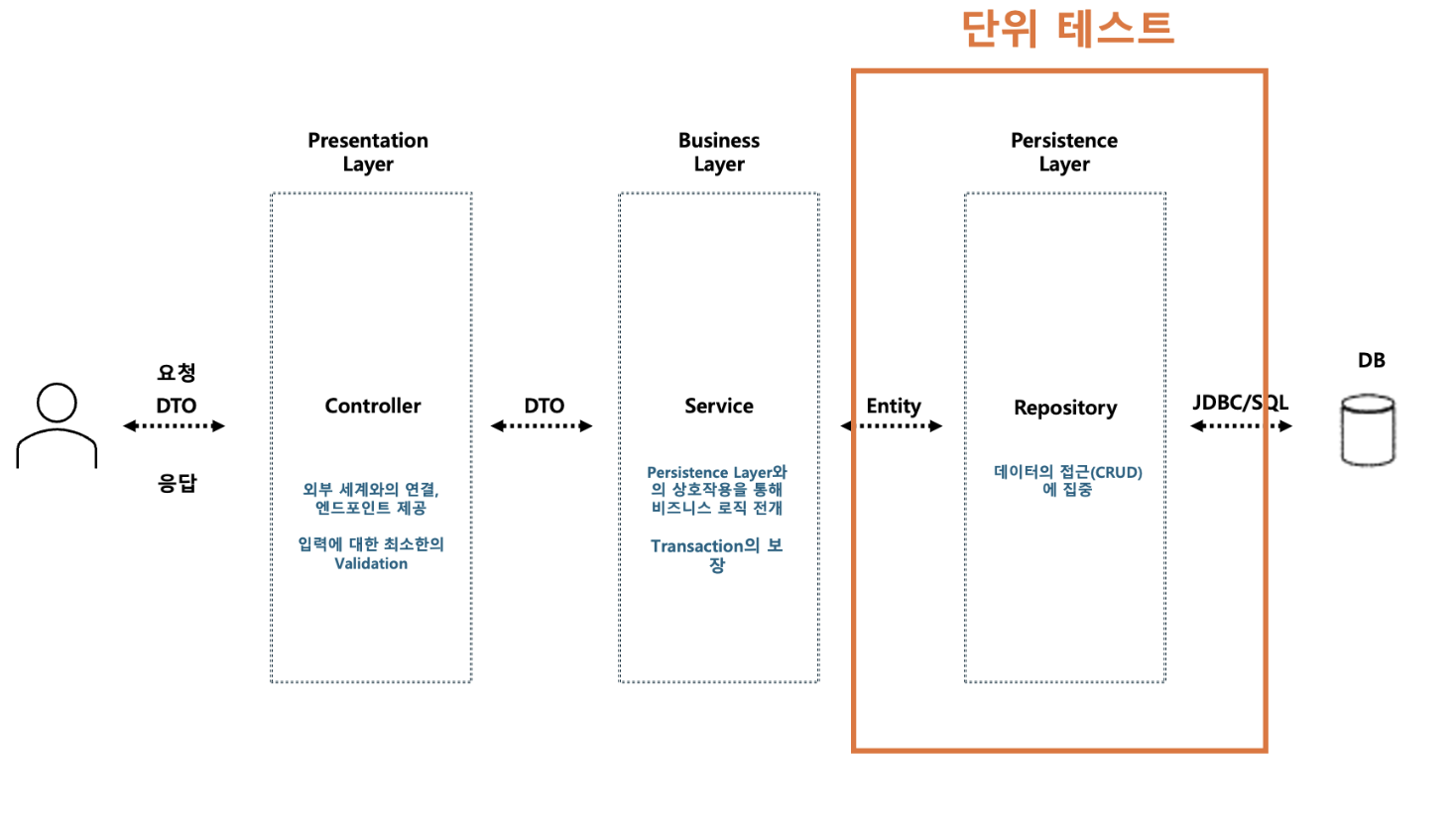- 비즈니스 로직 검증: Business Layer에서는 주로 비즈니스 규칙이 구현되기 때문에, 이 로직이 올바르게 동작하는지 검증해야 한다. 특히 경계값 분석 등을 통해서 동작 케이스와 예외 케이스에 대해서 특히 신경써서 테스트를 작성해야 한다.