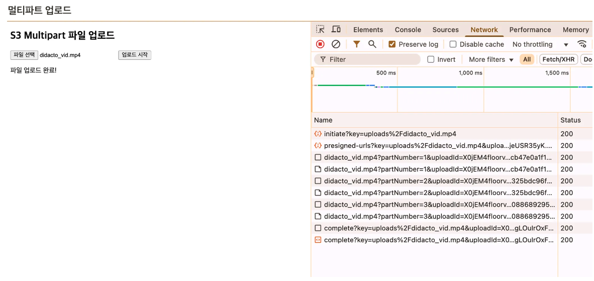 결과를 확인해보면 하나의 mp4 동영상 파일이 여러개의 Chunk 단위로 분리되어 Multipart 업로드 요청을 보내는 것을 네트워크에서 확인할 수 있다. S3 Bucket을 확인해보면 동영상이 정상적으로 업로드 된 것을 확인할 수 있다.