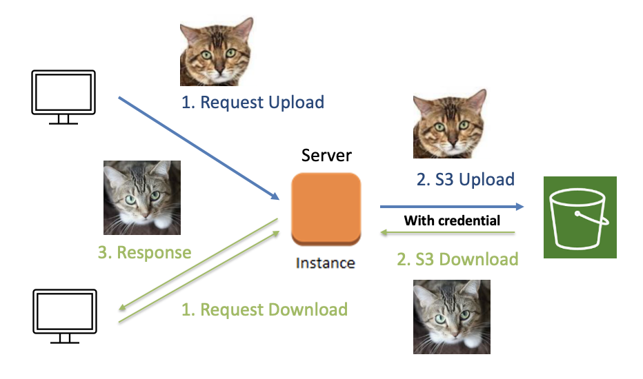 서버 → S3 (S3 Download, With credential) : 서버는 AWS 자격 증명을 사용하여 S3에서 파일을 다운로드