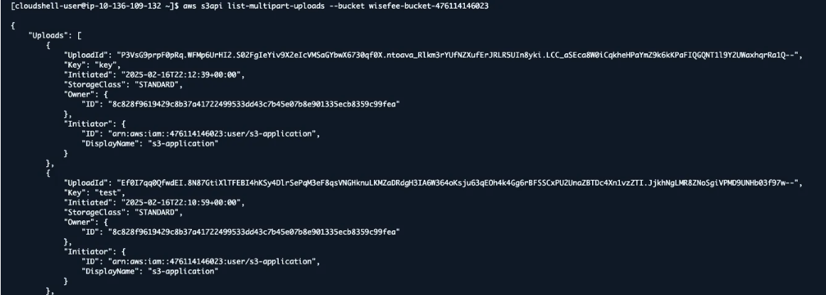 실제로 아래의 CLI 명령어를 실행해보면 정리되지 않은 중단된 멀티파트파일 데이터들을 확인할 수 있다.
